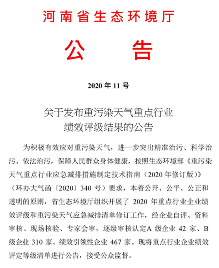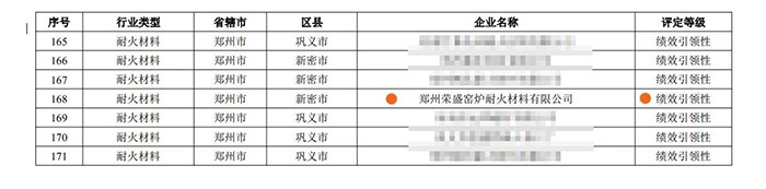 10月26日,在河南省生態(tài)環(huán)境廳印發(fā)了《關(guān)于發(fā)布重污染天氣重點(diǎn)行業(yè)績效評(píng)級(jí)結(jié)果的公告》(〔2020〕年11號(hào))中,鄭州榮盛窯爐耐火材料有限公司獲評(píng)“績效引領(lǐng)性企業(yè)”,這是繼公司榮獲“高新技術(shù)企業(yè)”、省級(jí)“科技型中小企業(yè)”后,再添喜訊。