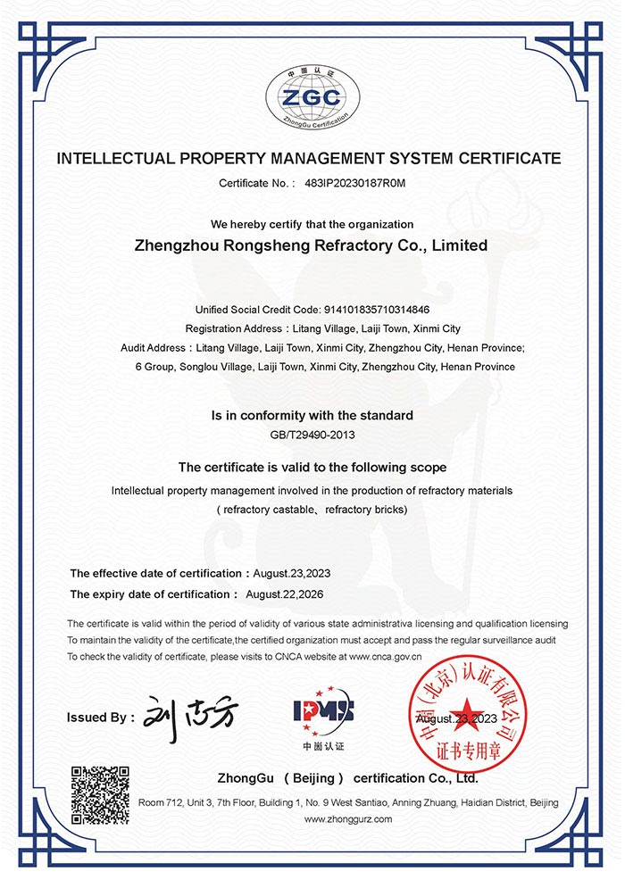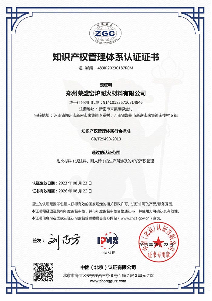 發(fā)布時(shí)間:2023/8/24 11:49:46 點(diǎn)擊率: 來(lái)源:高鋁磚廠家 作者:榮盛耐材近日,鄭州榮盛窯爐耐火材料有限公司(以下簡(jiǎn)稱「榮盛耐材」)順利通過(guò)國(guó)家知識(shí)產(chǎn)權(quán)貫標(biāo)認(rèn)證,并獲得了《知識(shí)產(chǎn)權(quán)管理體系認(rèn)證證書(shū)》中英文雙語(yǔ)認(rèn)證。該項(xiàng)認(rèn)證的順利通過(guò),標(biāo)志著榮盛耐材構(gòu)建了一套規(guī)范化、系統(tǒng)化、程序化、精細(xì)化的知識(shí)產(chǎn)權(quán)管理體系。